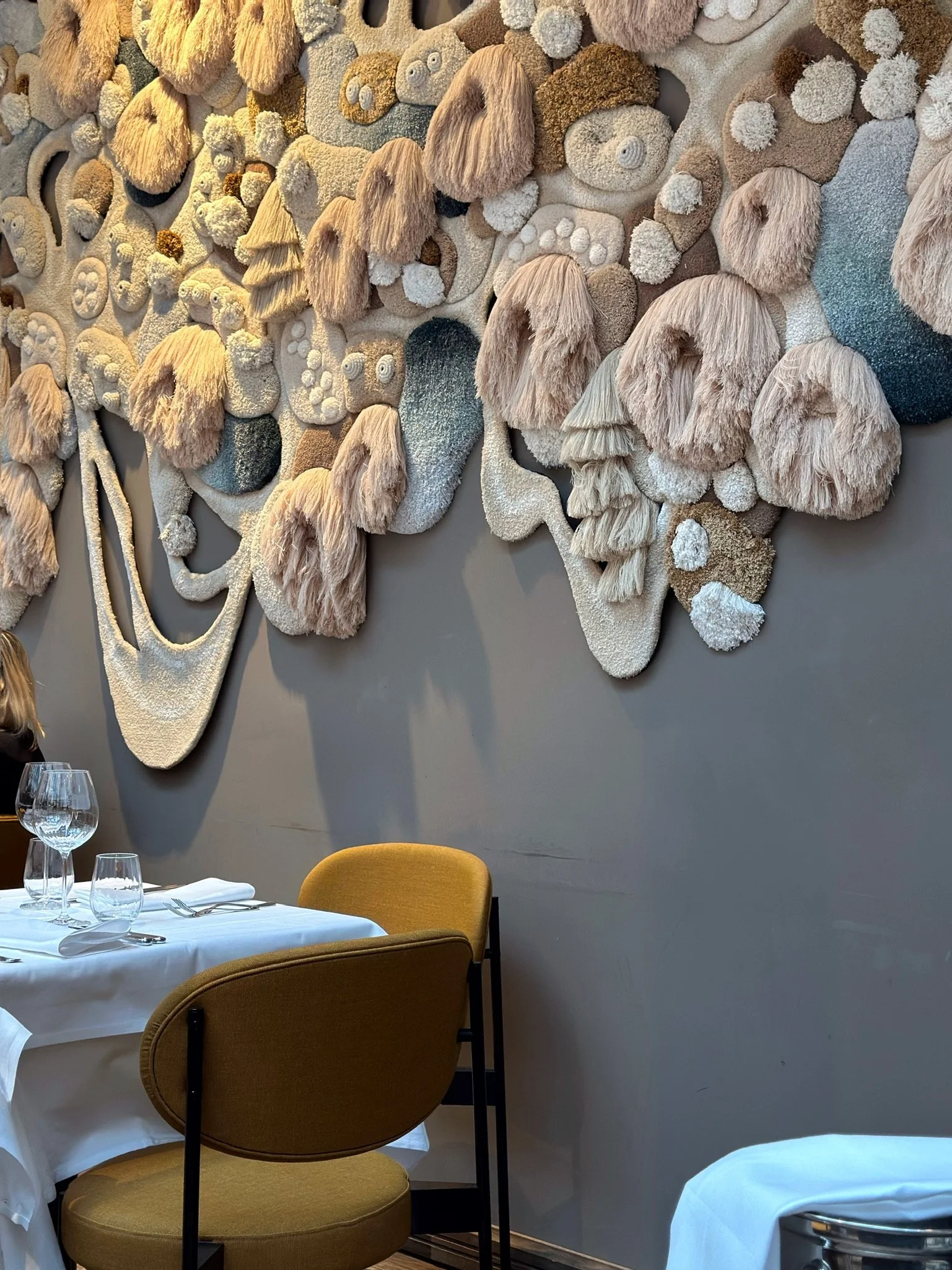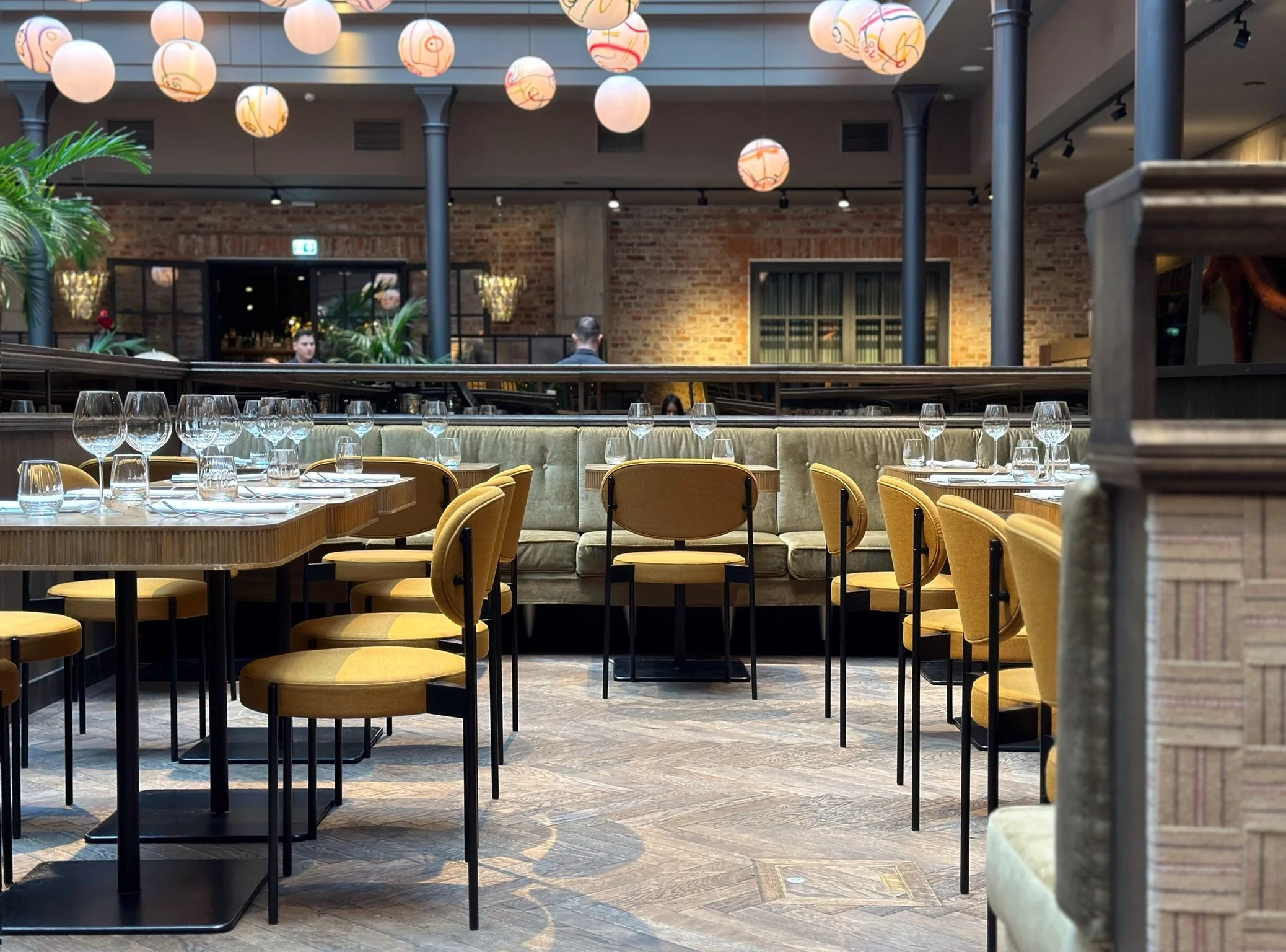 飯店餐廳Root Restaurant,以融合復古與現代為題,刻劃了精緻的細節──黑白相間棋盤式地磚,與高通透性的溫室屋頂交織,自然引入的陽光,為廳室內增添日夜不同的風采;令人著迷而相襯的軟裝配件,賦予空間另一種吸引力,藝術塗鴉的球型吊燈垂降於空間之中,鵝黃色的絨面布料與牆面的紅磚形成對比,活潑奔放而自然形塑的氛圍,將電報大樓往日的活力喚醒,重現優雅。酒吧Root Bar小型而別緻,其中更是體現著Art Deco裝飾藝術風格,紅色麂皮高腳椅呈現於吧台前,懸空的酒架環繞於梁柱外,柱體以不同紋路、深淺的木飾板拼貼交錯,呼應著自然紋理的人字拼地板,仿佛重回巴比倫歌劇院黃金時期,足具摩登現代感。